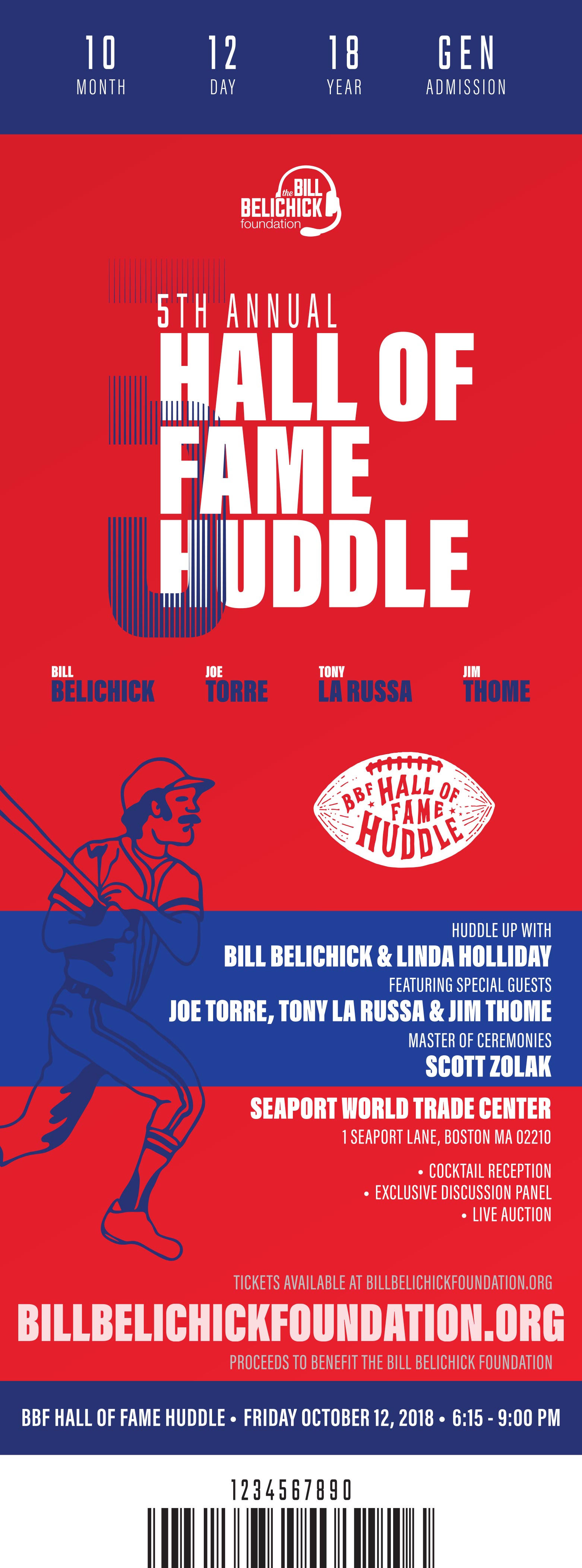 The 5th Annual Bill Belichick Foundation Hall of Fame Huddle will take place on October 12th at the Seaport World Trade Center hosted by Bill Belichick featuring Joe Torre, Tony La Russa, and Jim Thome – with Scott Zolak as the master of ceremonies and Jerod Mayo as auctioneer.